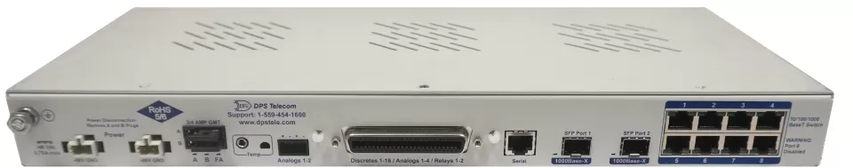 With 2 SFP fiber ports, LAN access for 7 network elements, 16 discrete alarms, 32 ping alarms, 8 analog inputs (4 general, 2 temp, 2 batt), and 2 controls, this efficient RTU is a perfect remote monitoring solution if you have remote sites without LAN transport.